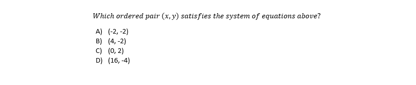 • Use the simpler equation to test your answer choices. In this case, the first equation is simpler, so try to use that one first and see if you can eliminate any answer choices. The correct ordered pair must work for both equations in the system.